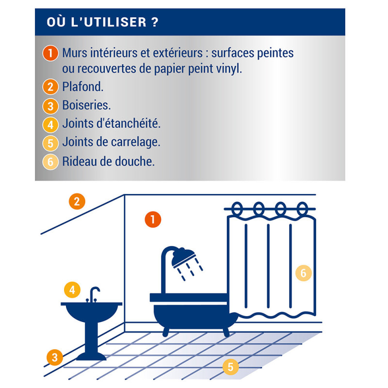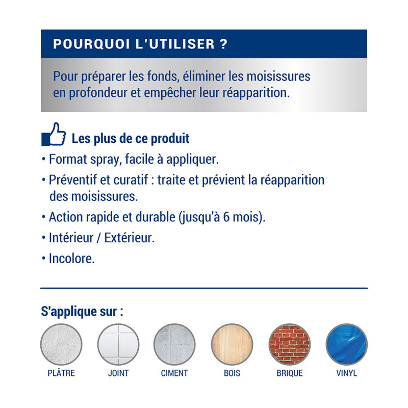Élimine sans frotter : traité les moisissures et micro-organismes sur surfaces intérieures et extérieures