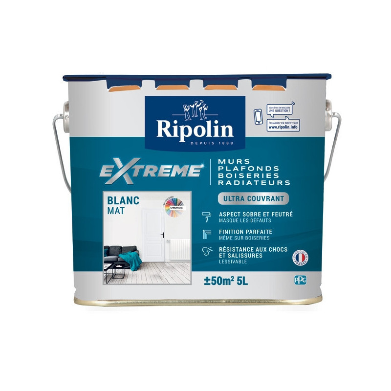 Peinture Ripolin extrême multi-supports murs, plafonds, boiseries et radiateurs blanc mat 5L