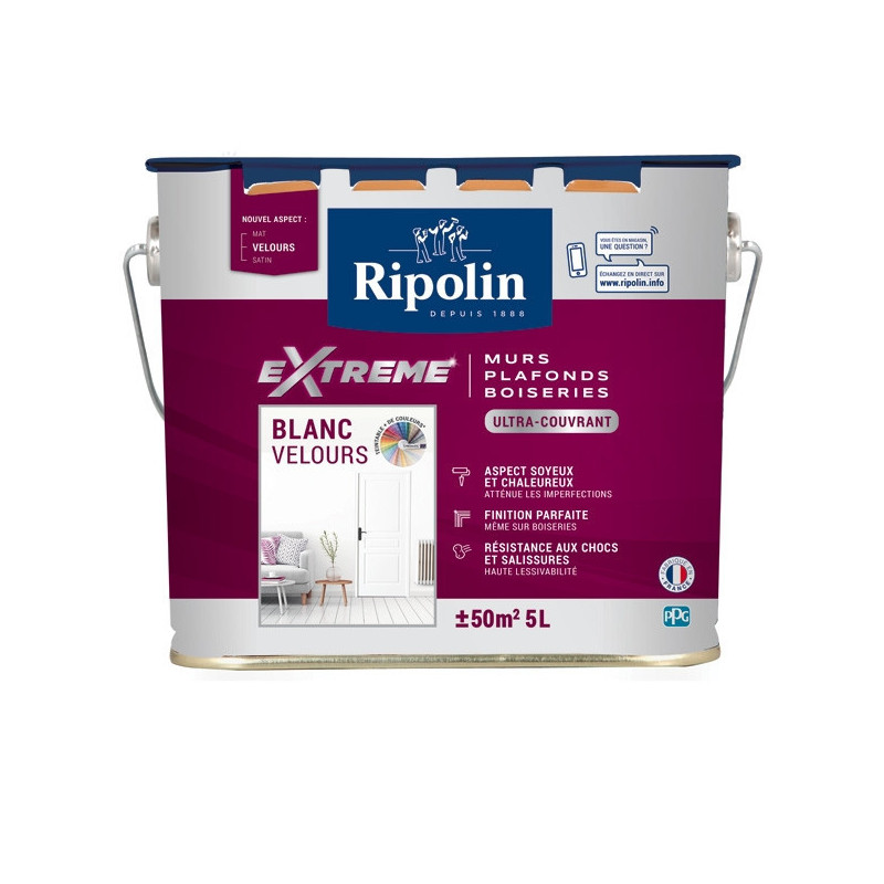 Peinture Ripolin extrême multi-supports murs, plafonds, boiseries et radiateurs blanc velours 5L