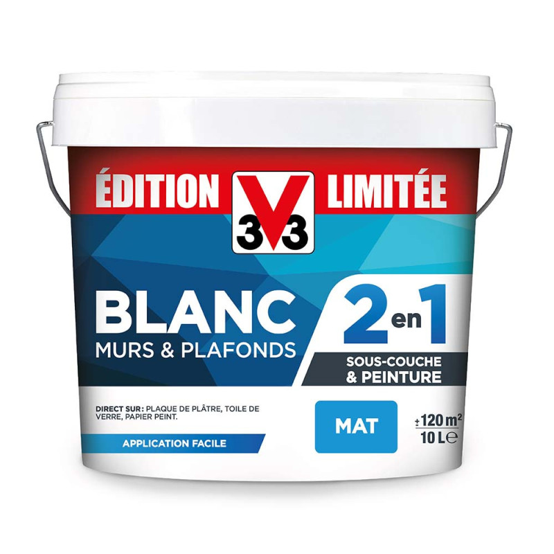 La peinture V33 murs et plafonds blanc mat 2 en 1 en Édition Limitée est idéale pour sublimer vos espaces intérieurs avec une finition élégante et homogène. Grâce à sa sous-couche intégrée, elle offre une application facile et un gain de temps considérable. Son haut pouvoir couvrant assure une adhérence optimale sur les murs et plafonds, tandis que son séchage rapide (30 minutes au toucher) permet une mise en œuvre efficace. Lavable et résistante, cette peinture blanche de fabrication française garantit un rendu durable. Disponible en pot de 10L, elle est parfaite pour vos travaux de rénovation ou de décoration et plus précisement adapté aux murs et plafonds intérieur. Pour des travaux NEUFS, directement sur supports bruts