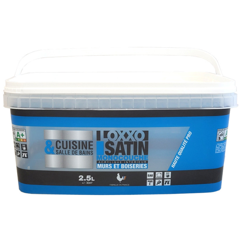 La peinture LOXXO murs et plafonds blanc satin 2,5L est une peinture acrylique monocouche de haute qualité, fabriquée en France, idéale pour les surfaces intérieures. Prête à l’emploi, elle offre une excellente couvrance et une finition satinée qui reflète la lumière, apportant éclat et luminosité à vos pièces. Sa grande blancheur agrandit visuellement l’espace, tandis que son aspect soyeux et légèrement brillant crée une ambiance chaleureuse et élégante. Polyvalente et lessivable, elle convient parfaitement à toutes les pièces de la maison, y compris les plus exposées comme les cuisines, couloirs ou chambres d’enfants. Facile à appliquer et à entretenir, la peinture blanc satin LOXXO allie performance, esthétisme et durabilité pour une décoration intérieure réussie.