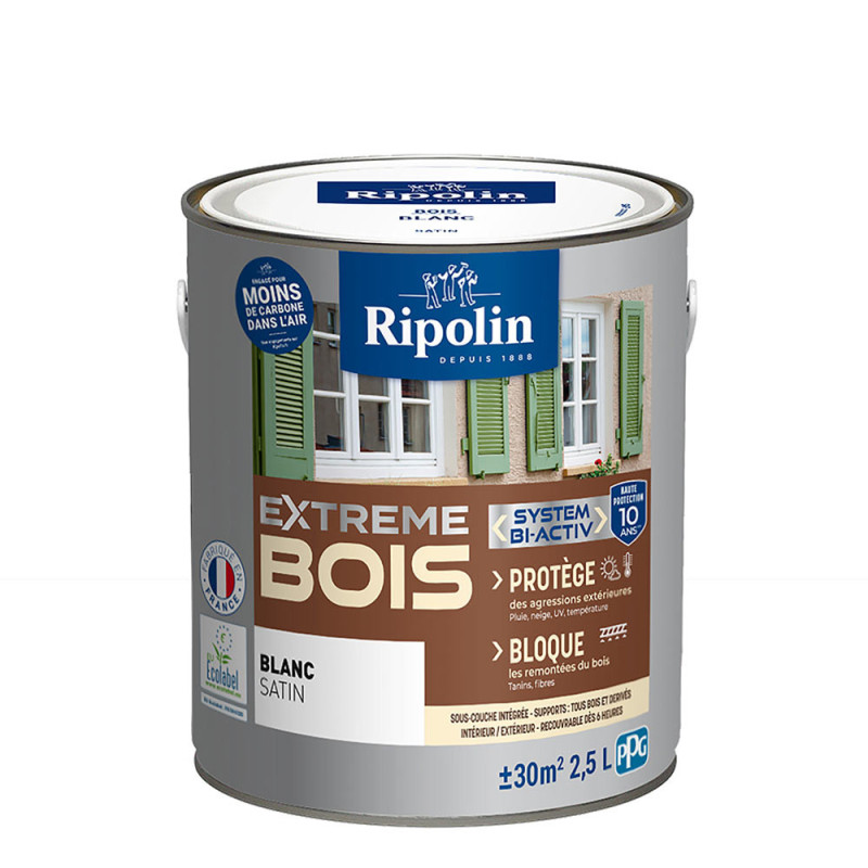 Peinture Ripolin extreme bois spécialement conçue pour la protection des bois. Grâce à cette peinture vous pourrez repeindre toutes vos boiseries intérieures et extérieures. Sa formulation garantie une efficacité pour une opacité, un bon séchage et une bonne résistance aux chocs et au lessivage. Elle a une très bonne stabilité des couleurs dans le temps. Cette peinture à une faible composotion nocive pour limiter son impact sur l'environnement. Elle bloque et fixe le support empêchant les remontées de tanin du bois. Son effet perlant lui assure une barrière anti-pluie et son agent nivelant un meilleur tendu du film de peinture. Ce produit est teintable au comptoir de la machine à teinter pour vous créer une couleur unique.