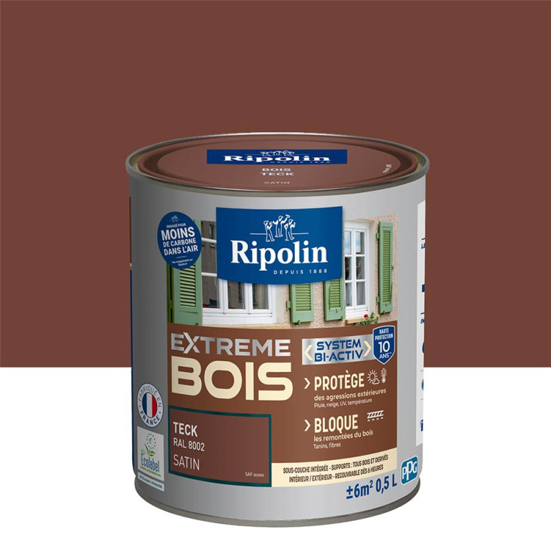 Protégez durablement vos boiseries avec la peinture bois Ripolin Extreme finition teck satin. Ultra couvrante, elle s'applique directement sans sous-couche pour un résultat professionnel rapide.