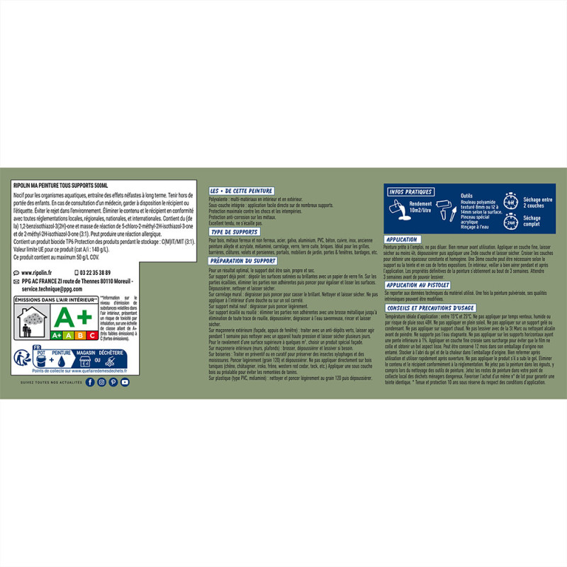 La PEINTURE TOUS SUPPORTS Ripolin est idéale pour embellir et protéger divers supports : volets en bois, portails en fer, mobilier de jardin en PVC ou pots de fleurs en terre cuite, grâce à un seul produit polyvalent.