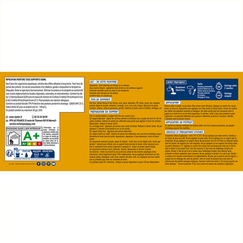 - Multi-supports : bois, cuivre, acier, acier galvanisé, plastique et PVC, mélaminé, terre cuite (tuile), fibrociment, béton, céramique