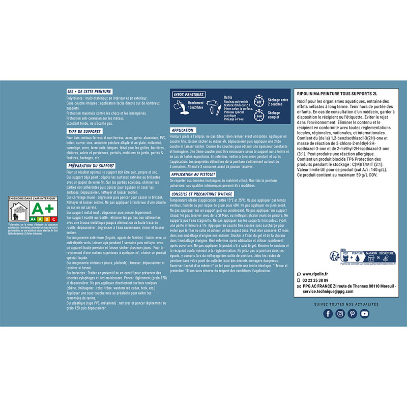 La PEINTURE TOUS SUPPORTS RIPOLIN est un produit polyvalent qui permet de décorer et de protéger des surfaces variées, allant des volets en bois aux portails en fer, en passant par le mobilier de jardin en PVC et les pots de fleurs en terre cuite.