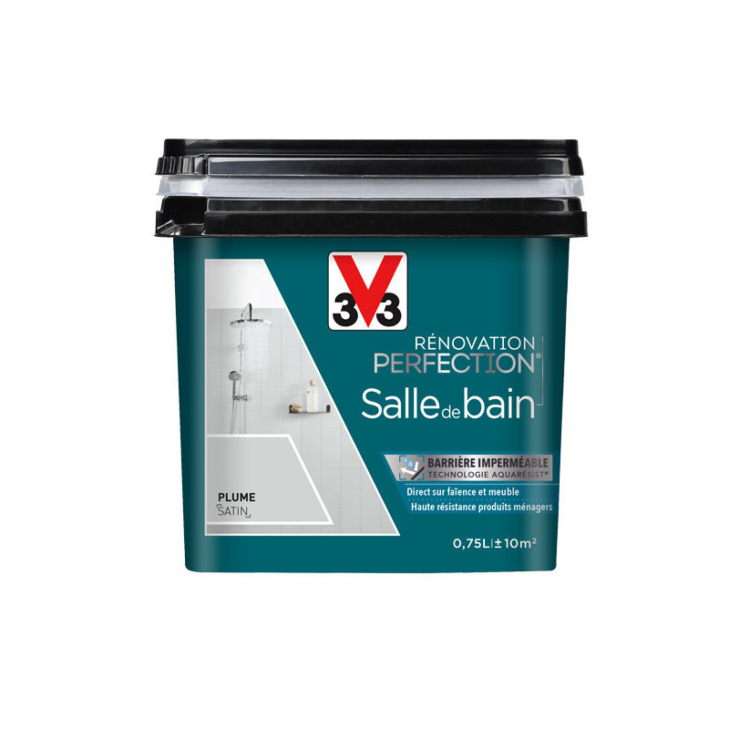 La peinture V33 Rénovation Salle de Bain couleur gris plume a été spécialement développée pour rénover tous meubles de salle de bain en bois bruts, vernis ou peints, mélaminé, stratifié, PVC, inox et métaux. Polyvalente, elle convient parfaitement sur les murs de salle de bain y compris l'intérieur de douche carrelé et s'appliquera sur de la faïence, du carrelage mural, mistel, brique de verre, boiserie... Cette peinture présente une haute résistance à l'eau grâce à sa protection imperméable et pourra s'appliquer directement sur la faïence et les meubles. Facile d'entretien et d'application. Tendu parfait. Séchage entre deux couches : 6 heures. Séchage complet en 48 heures avant la première.