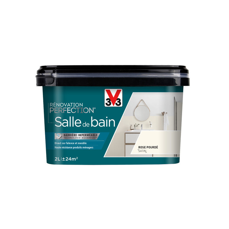 La peinture V33 Rénovation Salle de Bain couleur rose poudré a été spécialement développée pour rénover tous meubles de salle de bain en bois bruts, vernis ou peints, mélaminé, stratifié, PVC, inox et métaux. Polyvalente, elle convient parfaitement sur les murs de salle de bain y compris l'intérieur de douche carrelé et s'appliquera sur de la faïence, du carrelage mural, mistel, brique de verre, boiserie... Cette peinture présente une haute résistance à l'eau grâce à sa protection imperméable et pourra s'appliquer directement sur la faïence et les meubles. Facile d'entretien et d'application. Tendu parfait. Séchage entre deux couches : 6 heures. Séchage complet en 48 heures avant la première.