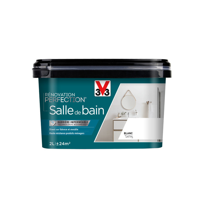 La peinture V33 Rénovation Salle de Bain couleur blanc satin a été spécialement développée pour rénover tous meubles de salle de bain en bois bruts, vernis ou peints, mélaminé, stratifié, PVC, inox et métaux. Polyvalente, elle convient parfaitement sur les murs de salle de bain y compris l'intérieur de douche carrelé et s'appliquera sur de la faïence, du carrelage mural, mistel, brique de verre, boiserie... Cette peinture présente une haute résistance à l'eau grâce à sa protection imperméable et pourra s'appliquer directement sur la faïence et les meubles. Facile d'entretien et d'application. Tendu parfait. Séchage entre deux couches : 6 heures. Séchage complet en 48 heures avant la première.