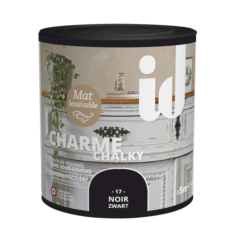 La peinture Charme romantique couleur noir de Id déco est une peinture lavable, mate, multisupport. Elle est idéale pour les meubles, objets & boiseries en application directe sur bois brut, bois peint ou bois vernis. Pour obtenir une surface lessivable et résistante aux taches, appliquez le protecteur extra mat ou le protecteur haute résistance. Vous pouvez donner une finition blanche cérusée avec la patine blanche.