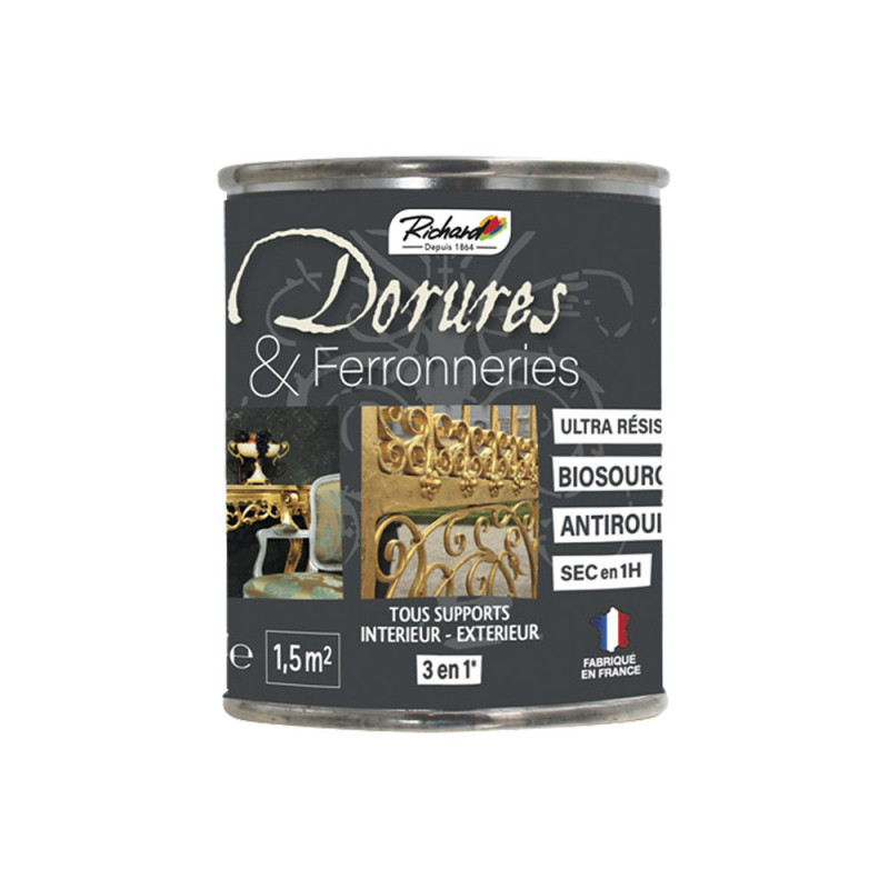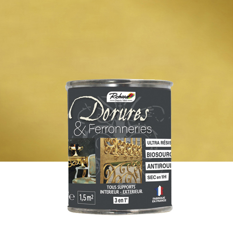 Optez pour la peinture Richard multi-support 3 en 1 dorure or pâle 125 ml, idéale pour vos projets de décoration en intérieur comme en extérieur. Ultra résistante, cette peinture biosourcée offre une excellente tenue dans le temps tout en respectant l’environnement. Sa formule antirouille en fait un choix parfait pour les surfaces métalliques, tandis que son séchage rapide en 1 heure permet une application pratique et efficace. Polyvalente et élégante, elle apporte une finition dorée subtile et raffinée à tous vos supports.
