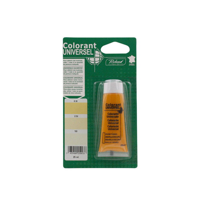 Le colorant universel à usage intérieur ou extérieur jaune foncé permet de teinter toutes les peintures usuelles, utilisées dans le grand public et le bâtiment : peiture émulsions vinyliques ou acryliques, peintures mates, satinées brillantes, peintures à l'huile … Tous ces colorants sont solides à la lumière et aux intempéries. Seules les couleurs jaune, rouge, vert et orange ne sont pas recommandées à l'extérieur lorsqu'elles sont utilisées dans les teintes pastel.