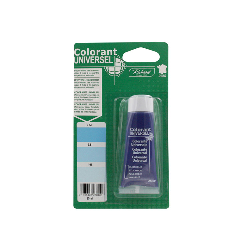 Le colorant universel à usage intérieur ou extérieur bleu hélio permet de teinter toutes les peintures usuelles, utilisées dans le grand public et le bâtiment : peiture émulsions vinyliques ou acryliques, peintures mates, satinées brillantes, peintures à l'huile … Tous ces colorants sont solides à la lumière et aux intempéries. Seules les couleurs jaune, rouge, vert et orange ne sont pas recommandées à l'extérieur lorsqu'elles sont utilisées dans les teintes pastel.