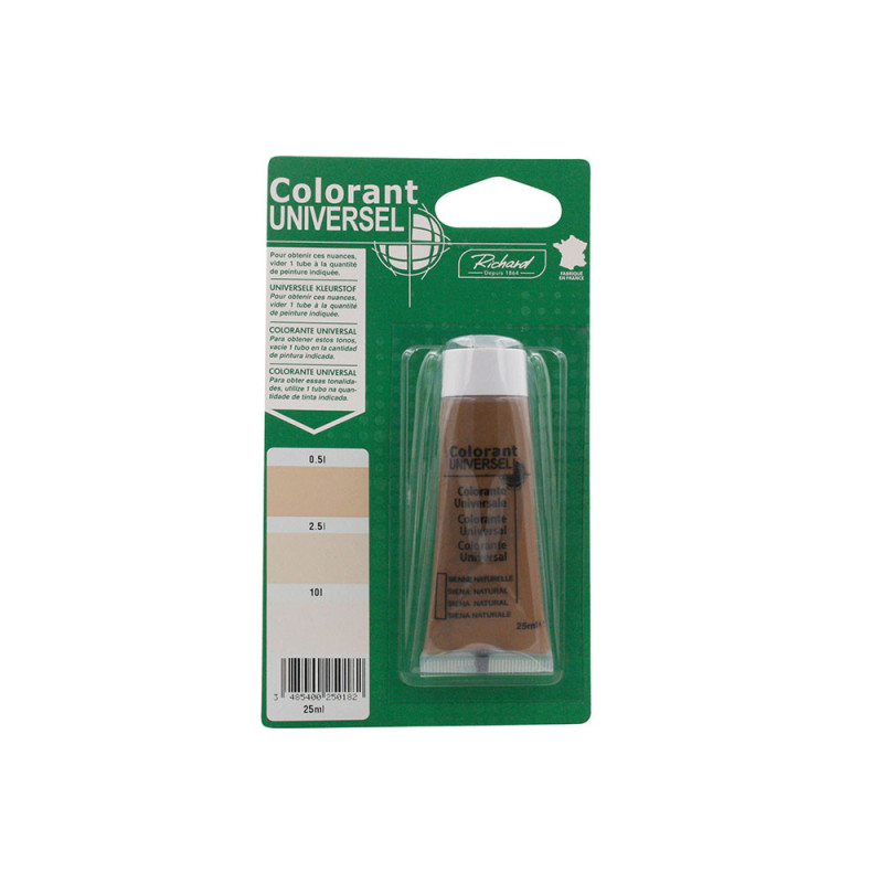 Le colorant universel à usage intérieur ou extérieur sienne naturelle permet de teinter toutes les peintures usuelles, utilisées dans le grand public et le bâtiment : peiture émulsions vinyliques ou acryliques, peintures mates, satinées brillantes, peintures à l'huile … Tous ces colorants sont solides à la lumière et aux intempéries. Seules les couleurs jaune, rouge, vert et orange ne sont pas recommandées à l'extérieur lorsqu'elles sont utilisées dans les teintes pastel.