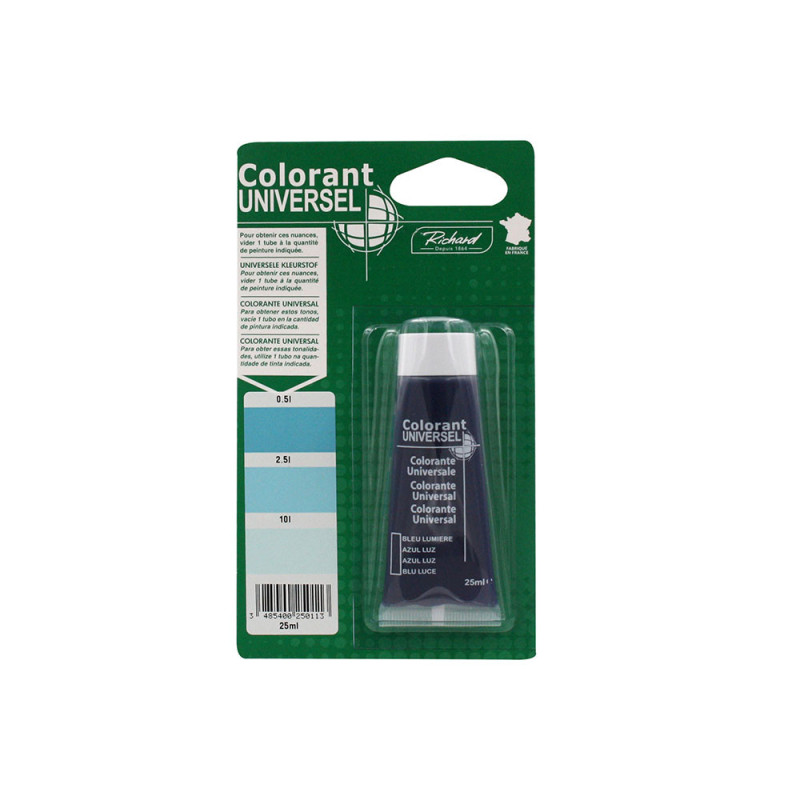Le colorant universel à usage intérieur ou extérieur bleu lumière permet de teinter toutes les peintures usuelles, utilisées dans le grand public et le bâtiment : peiture émulsions vinyliques ou acryliques, peintures mates, satinées brillantes, peintures à l'huile … Tous ces colorants sont solides à la lumière et aux intempéries. Seules les couleurs jaune, rouge, vert et orange ne sont pas recommandées à l'extérieur lorsqu'elles sont utilisées dans les teintes pastel.