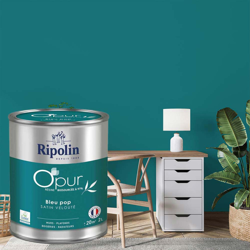 La gamme de peinture Ripolin Opur couleur bleu pop est composée à 97% de résines bio-sourcées. Elle associe haute qualité et performance tout en contribuant à la préservation de votre santé et de l'environnement. Idéale pour toutes les pièces de la maison. Nous recommandons un lessivage après 3 semaines de pose.