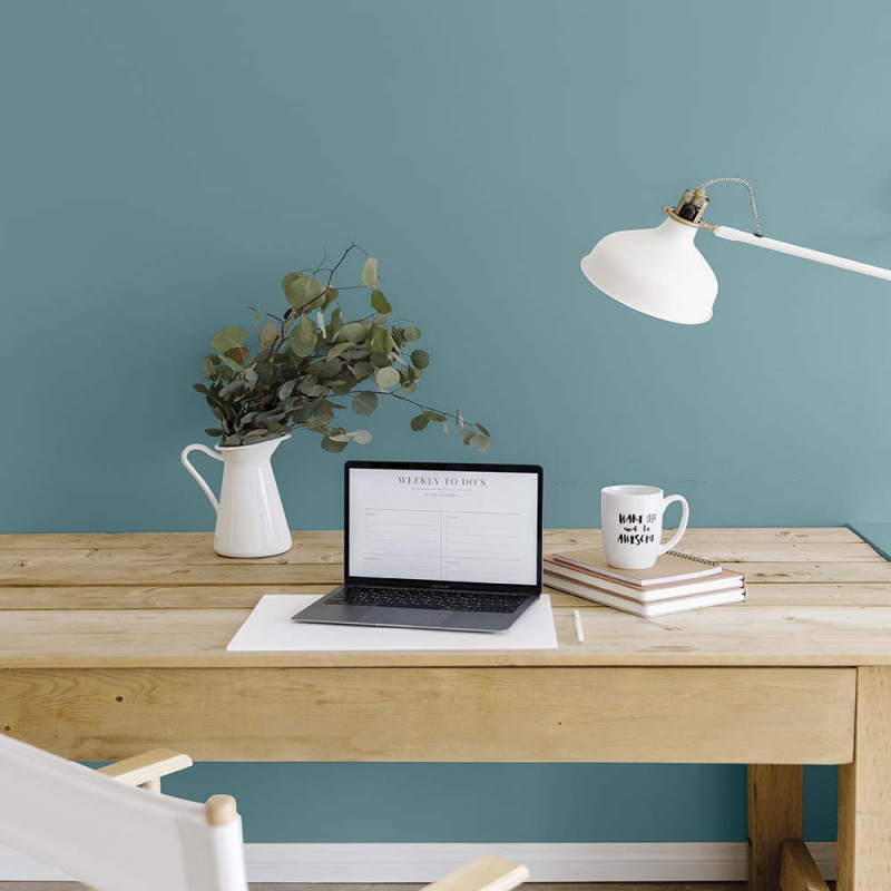 La peinture velours Algo Bleu Charmant, bio-sourcée et multi-supports (murs, plafonds, boiseries), offre un bleu raffiné aux subtiles nuances de gris et de vert, idéal pour un bureau, une chambre ou une entrée. Composée à 98% de composants naturels (algues, résine végétale, extraits calcaires et minéraux), elle est saine pour l’intérieur. Ce bleu doux et accueillant peut être appliqué par touches pour préserver la luminosité ou en fond pour valoriser les façades de cuisine et créer un espace familial chaleureux. Sa finition velours apporte un aspect feutré et décoratif, facile d'entretien et en parfaite harmonie avec les essences de bois.