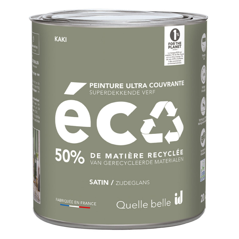 La peinture ID ECO vert kaki satin 2L est une peinture murale écoresponsable, formulée pour allier performance, confort d’application et respect de l’environnement. Dotée d’une grande opacité et d’une finition satinée élégante, elle assure une couvrance homogène dès la première couche. Sans odeur et lessivable, elle est idéale pour les pièces de vie, offrant un entretien facile au quotidien. Composée à 50 % de matières recyclées résine issue de pare-brises, charges minérales provenant de coquilles d’huîtres et de poudre de marbre elle limite son impact environnemental. Son taux de COV inférieur à 1 g/L garantit une meilleure qualité de l’air intérieur. Conditionnée en pot métallique recyclable, cette peinture combine efficacité et éthique. La teinte vert kaki, naturelle et contemporaine, apporte chaleur et profondeur aux murs, avec un rendement d’environ 12 m²/L.