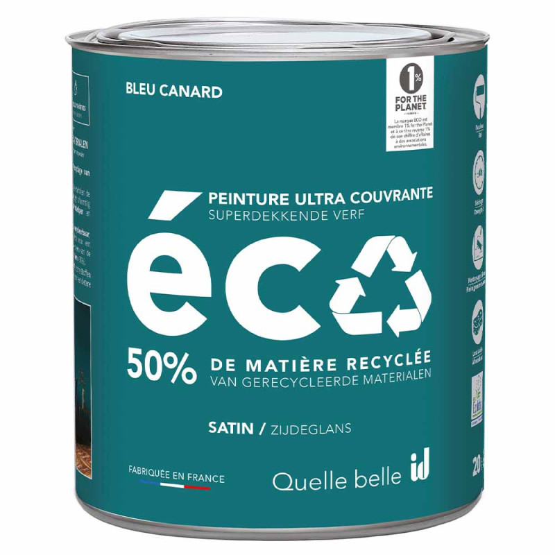 Cette peinture bleu canard écologique se distingue par son procédé de fabrication circulaire révolutionnaire. Son film sec intègre 50% de ressources recyclées.