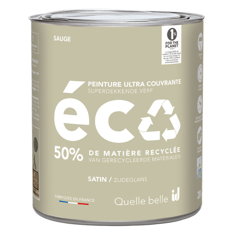 Cette peinture vert sauge écologique s'appuie sur un procédé de valorisation circulaire unique. Sa formulation finale contient 50% de ressources recyclées.