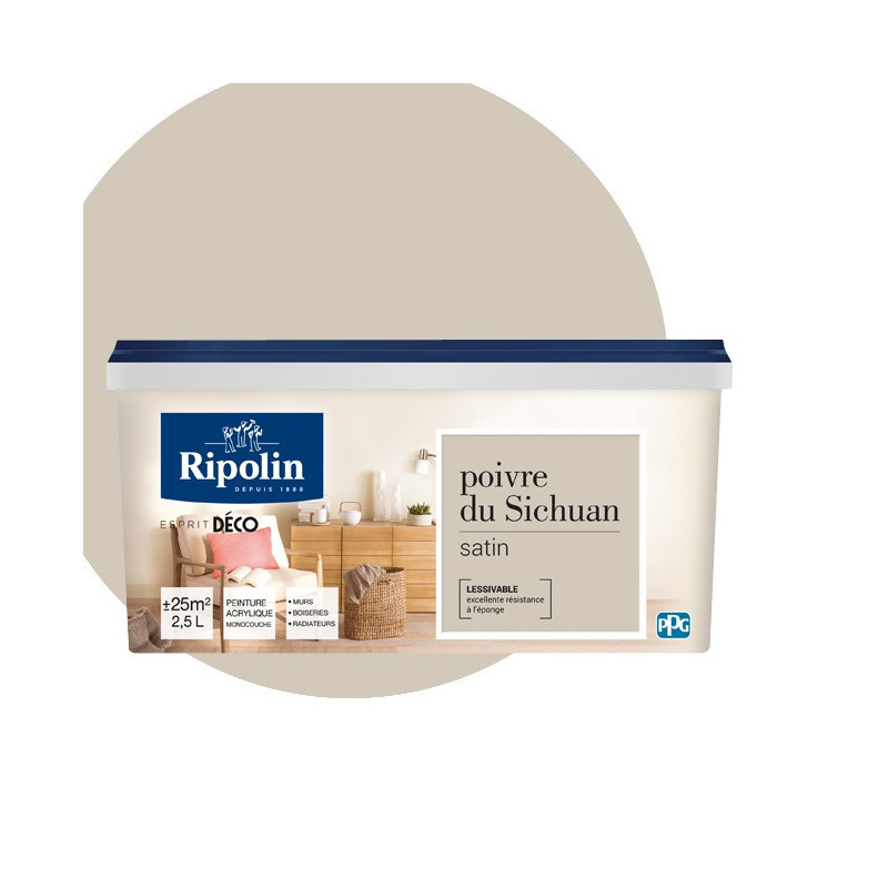 La gamme RIPOLIN Esprit Déco poivre de sichuan satin permet de redécorer toutes les pièces pour suivre toutes les idées et toutes les envies. Peinture monocouche au bon pouvoir opacifiant, elle s'applique facilement sur les murs, les boiseries et les radiateurs. Ce produit est disponible en plusieurs teintes et en blanc.