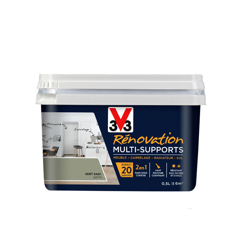 La peinture V33 Rénovation Multi-supports a été spécialement développée pour rénover toutes les surfaces, dans toutes les pièces de la maison. Polyvalente, elle convient parfaitement sur les murs, boiseries, radiateurs, fenêtres, portes, meubles intégrés, mobiliers, objets, plans de travail, sols, escaliers...Elle conviendra pour des supports en : bois (brut, verni, peint, lasuré , toutes essences), dérivés de bois (mélaminé, stratifié, osb, contreplaqué), carrelage (faïence, listel, granit, grès), métal (ferreux et non ferreux), verre. Cette peinture est polyvalente, présente une haute résistance à l'eau, aux tâches, aux rayures, aux chocs...Facile d'entretien et d'application. Séchage entre deux couches : 6 heures. Séchage complet en 24 heures.