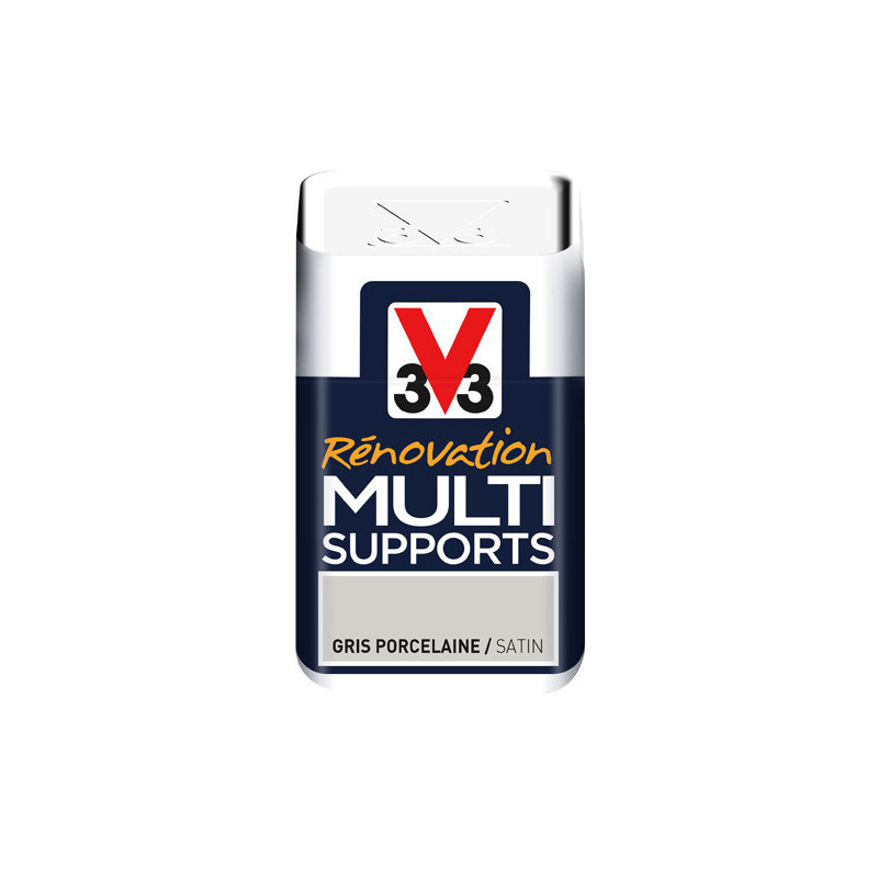 La peinture V33 Rénovation Multi-supports a été spécialement développée pour rénover toutes les surfaces, dans toutes les pièces de la maison. Polyvalente, elle convient parfaitement sur les murs, boiseries, radiateurs, fenêtres, portes, meubles intégrés, mobiliers, objets, plans de travail, sols, escaliers...Elle conviendra pour des supports en : bois (brut, verni, peint, lasuré , toutes essences), dérivés de bois (mélaminé, stratifié, osb, contreplaqué), carrelage (faïence, listel, granit, grès), métal (ferreux et non ferreux), verre. Cette peinture est polyvalente, présente une haute résistance à l'eau, aux tâches, aux rayures, aux chocs...Facile d'entretien et d'application. Séchage entre deux couches : 6 heures. Séchage complet en 24 heures.