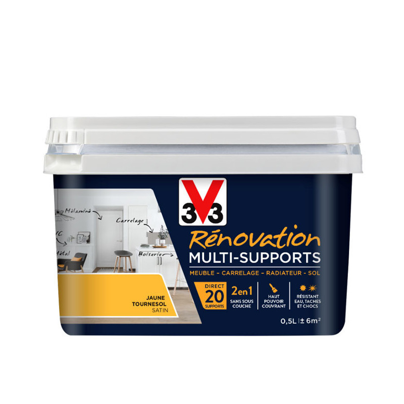 La peinture V33 Rénovation Multi-supports a été spécialement développée pour rénover toutes les surfaces, dans toutes les pièces de la maison. Polyvalente, elle convient parfaitement sur les murs, boiseries, radiateurs, fenêtres, portes, meubles intégrés, mobiliers, objets, plans de travail, sols, escaliers...Elle conviendra pour des supports en : bois (brut, verni, peint, lasuré , toutes essences), dérivés de bois (mélaminé, stratifié, osb, contreplaqué), carrelage (faïence, listel, granit, grès), métal (ferreux et non ferreux), verre. Cette peinture est polyvalente, présente une haute résistance à l'eau, aux tâches, aux rayures, aux chocs...Facile d'entretien et d'application. Séchage entre deux couches : 6 heures. Séchage complet en 24 heures.
