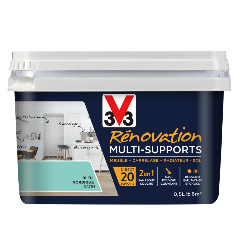La peinture V33 Rénovation Multi-supports a été spécialement développée pour rénover toutes les surfaces, dans toutes les pièces de la maison. Polyvalente, elle convient parfaitement sur les murs, boiseries, radiateurs, fenêtres, portes, meubles intégrés, mobiliers, objets, plans de travail, sols, escaliers...Elle conviendra pour des supports en : bois (brut, verni, peint, lasuré , toutes essences), dérivés de bois (mélaminé, stratifié, osb, contreplaqué), carrelage (faïence, listel, granit, grès), métal (ferreux et non ferreux), verre. Cette peinture est polyvalente, présente une haute résistance à l'eau, aux tâches, aux rayures, aux chocs...Facile d'entretien et d'application. Séchage entre deux couches : 6 heures. Séchage complet en 24 heures.