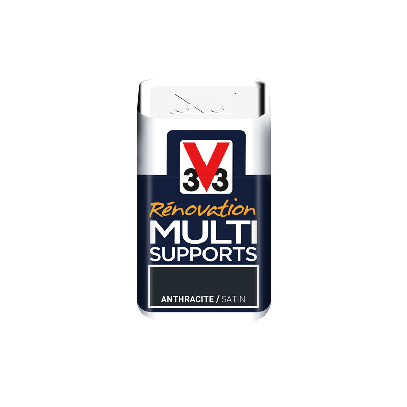 La peinture V33 Rénovation Multi-supports a été spécialement développée pour rénover toutes les surfaces, dans toutes les pièces de la maison. Polyvalente, elle convient parfaitement sur les murs, boiseries, radiateurs, fenêtres, portes, meubles intégrés, mobiliers, objets, plans de travail, sols, escaliers...Elle conviendra pour des supports en : bois (brut, verni, peint, lasuré , toutes essences), dérivés de bois (mélaminé, stratifié, osb, contreplaqué), carrelage (faïence, listel, granit, grès), métal (ferreux et non ferreux), verre. Cette peinture est polyvalente, présente une haute résistance à l'eau, aux tâches, aux rayures, aux chocs...Facile d'entretien et d'application. Séchage entre deux couches : 6 heures. Séchage complet en 24 heures.