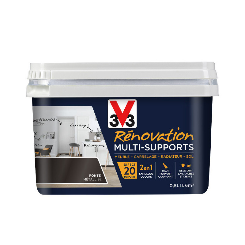 La peinture V33 Rénovation Multi-supports a été spécialement développée pour rénover toutes les surfaces, dans toutes les pièces de la maison. Polyvalente, elle convient parfaitement sur les murs, boiseries, radiateurs, fenêtres, portes, meubles intégrés, mobiliers, objets, plans de travail, sols, escaliers...Elle conviendra pour des supports en : bois (brut, verni, peint, lasuré , toutes essences), dérivés de bois (mélaminé, stratifié, osb, contreplaqué), carrelage (faïence, listel, granit, grès), métal (ferreux et non ferreux), verre. Cette peinture est polyvalente, présente une haute résistance à l'eau, aux tâches, aux rayures, aux chocs...Facile d'entretien et d'application. Séchage entre deux couches : 6 heures. Séchage complet en 24 heures.