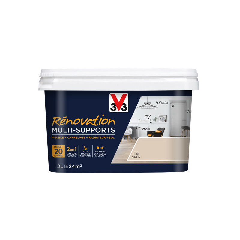 La peinture V33 Rénovation Multi-supports a été spécialement développée pour rénover toutes les surfaces, dans toutes les pièces de la maison. Polyvalente, elle convient parfaitement sur les murs, boiseries, radiateurs, fenêtres, portes, meubles intégrés, mobiliers, objets, plans de travail, sols, escaliers...Elle conviendra pour des supports en : bois (brut, verni, peint, lasuré , toutes essences), dérivés de bois (mélaminé, stratifié, osb, contreplaqué), carrelage (faïence, listel, granot, grès), métal (ferreux et non ferreux), verre. Cette peinture présente une haute résistance à l'eau, aux tâches, aux rayures, aux chocs...Facile d'entretien et d'application. Séchage entre deux couches : 6 heures. Séchage complet en 24 heures.