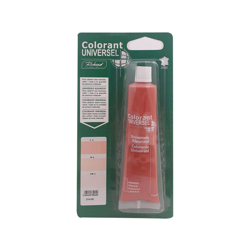Le colorant universel à usage intérieur ou extérieur orange permet de teinter toutes les peintures usuelles, utilisées dans le grand public et le bâtiment : peinture émulsions vinyliques ou acryliques, peintures mates, satinées brillantes, peintures à l'huile … Tous ces colorants sont solides à la lumière et aux intempéries. Seuls les jaune, rouge, vert et le orange ne sont pas recommandés à l'extérieur lorsqu'ils sont utilisés dans les teintes pastel.