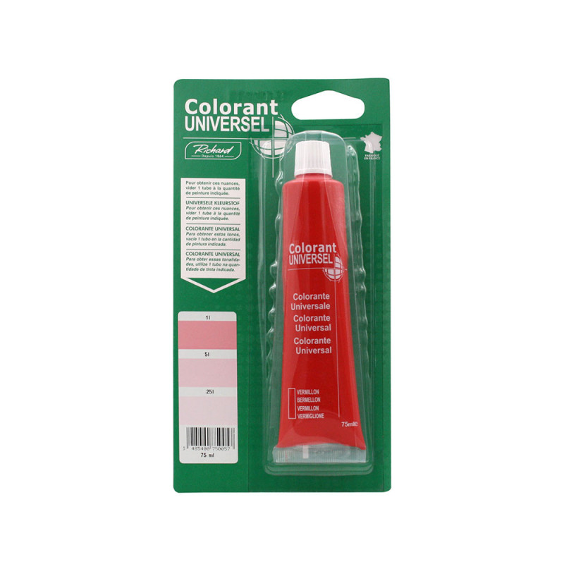 Le colorant universel à usage intérieur ou extérieur vermillon permet de teinter toutes les peintures usuelles, utilisées dans le grand public et le bâtiment : peinture émulsions vinyliques ou acryliques, peintures mates, satinées brillantes, peintures à l'huile … Tous ces colorants sont solides à la lumière et aux intempéries. Seuls les jaune, rouge, vert et le orange ne sont pas recommandés à l'extérieur lorsqu'ils sont utilisés dans les teintes pastel.