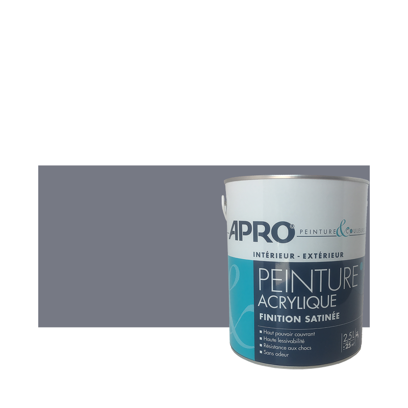 Peinture acrylique Apro satin multi-supports intérieur extérieur pour murs, plafonds, boiseries, plinthes de toutes les pièces à vivre de la maison (séjour, chambre ,bureau ,dressing). Convient également pour les bois extérieurs.