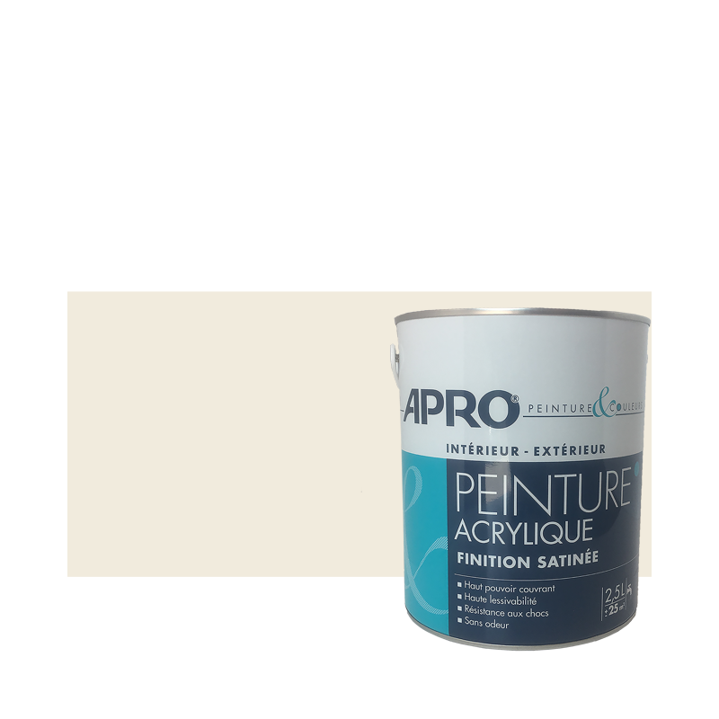 Peinture acrylique Apro satin multi-supports intérieur extérieur pour murs, plafonds, boiseries, plinthes de toutes les pièces à vivre de la maison (séjour, chambre ,bureau ,dressing). Convient également pour les bois extérieurs.