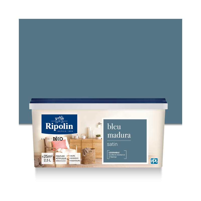 Peinture RIPOLIN Esprit Déco murs, plafonds, boiseries et radiateurs bleu madura satin 2,5L