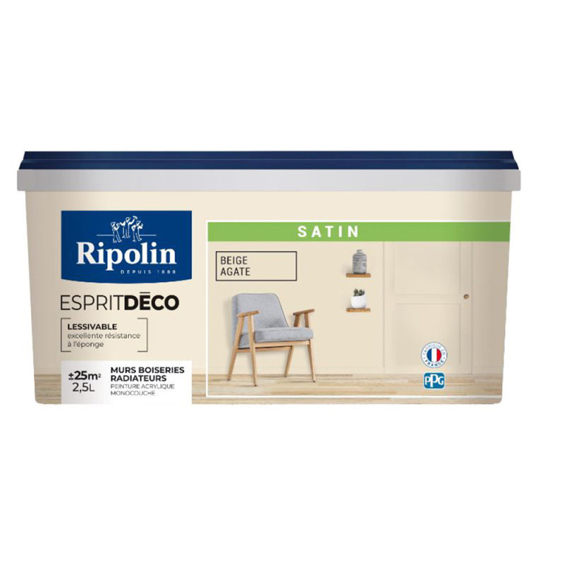 Peinture RIPOLIN Esprit Déco murs, plafonds, boiseries et radiateurs beige agate satin 2,5L