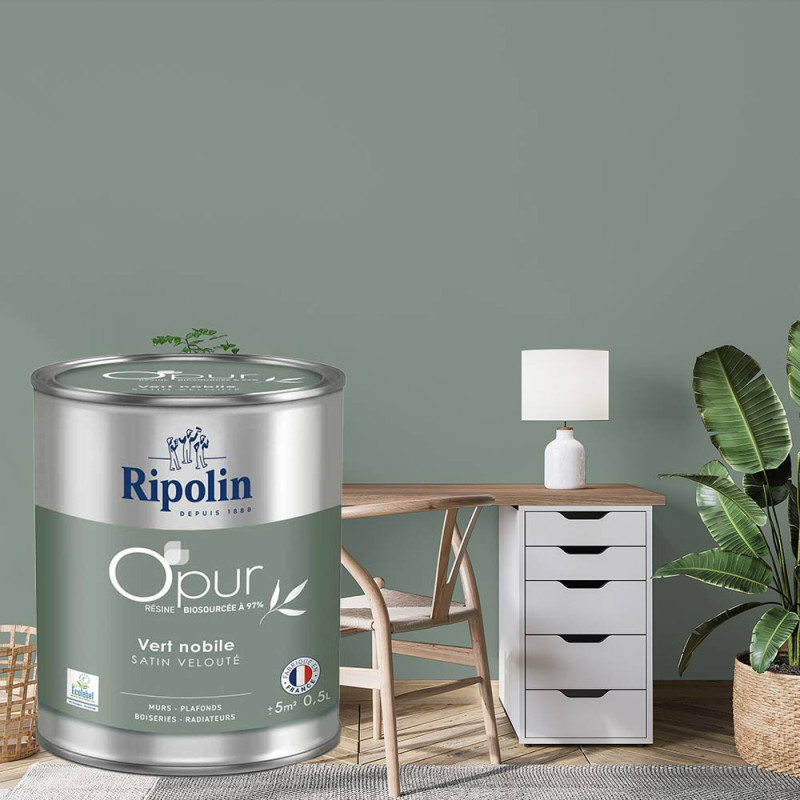 La gamme de peinture Ripolin Opur couleur vert nobile est composée à 97% de résines bio-sourcées. Elle associe haute qualité et performance tout en contribuant à la préservation de votre santé et de l'environnement.