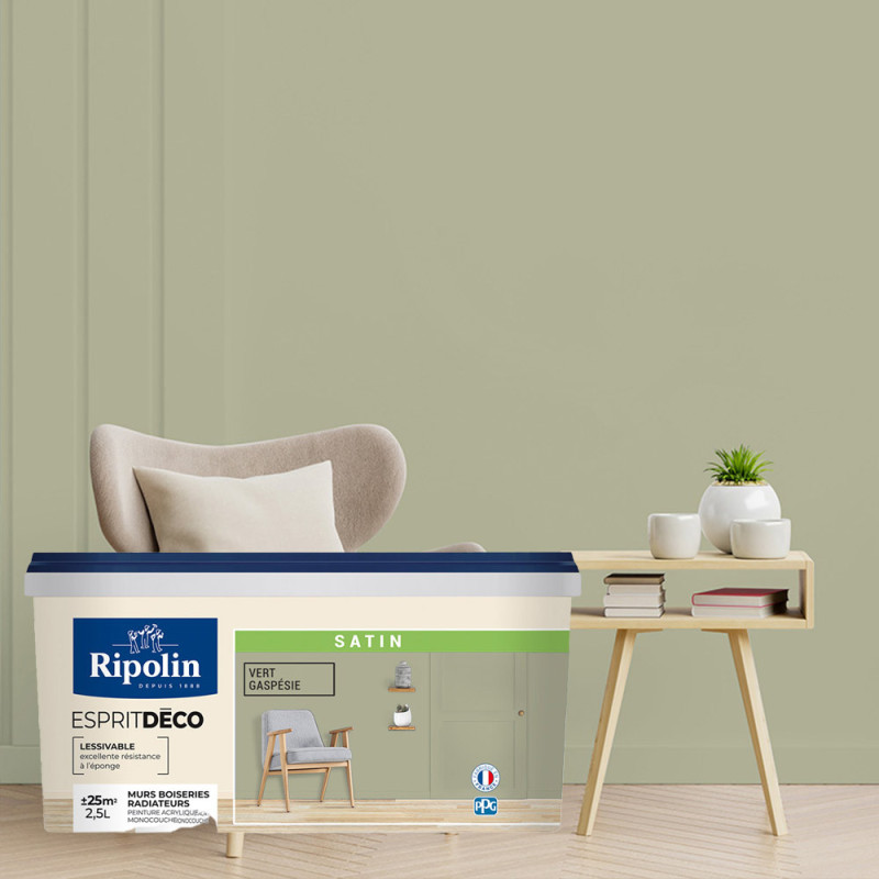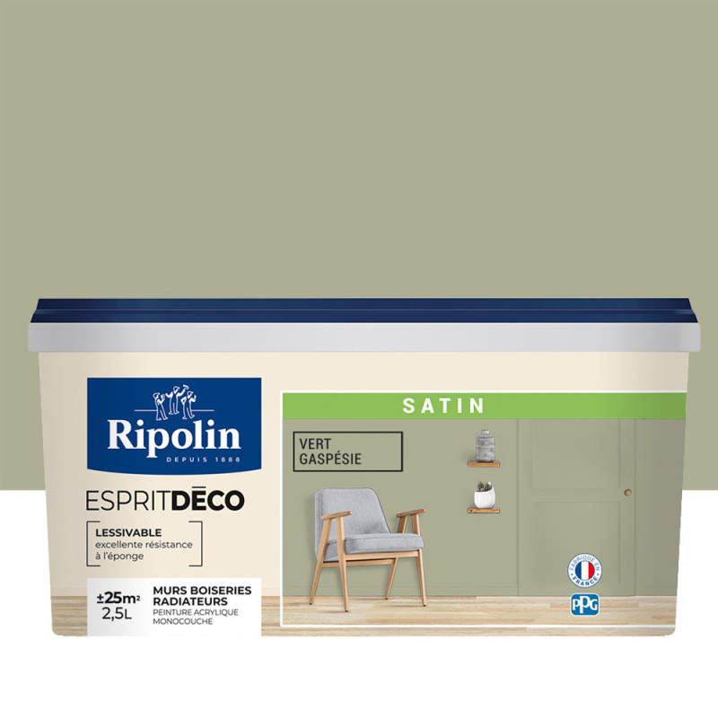 Peinture murs boiseries radiateurs Esprit Déco Ripolin vert gaspesie 2.5L. La gamme RIPOLIN Esprit Déco permet de redécorer toutes les pièces pour suivre toutes les idées et toutes les envies. Peinture monocouche au bon pouvoir opacifiant, elle s'applique facilement sur les murs, les boiseries et les radiateurs.