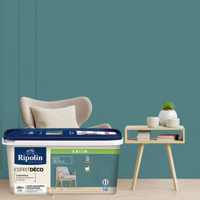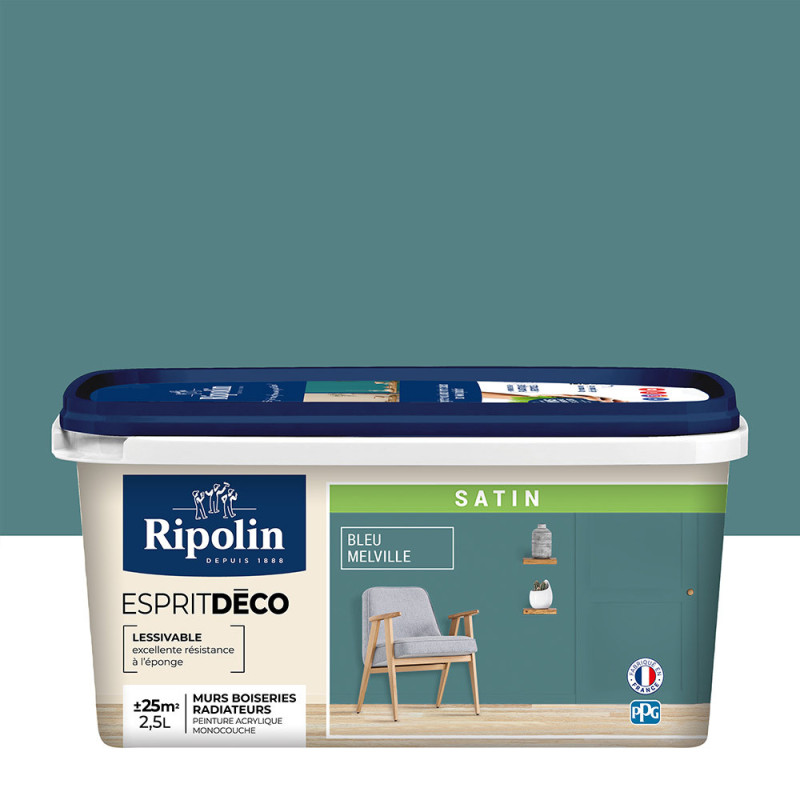 Peinture murs boiseries radiateurs Esprit Déco Ripolin bleu melville 2.5L. La gamme RIPOLIN Esprit Déco permet de redécorer toutes les pièces pour suivre toutes les idées et toutes les envies. Peinture monocouche au bon pouvoir opacifiant, elle s'applique facilement sur les murs, les boiseries et les radiateurs.