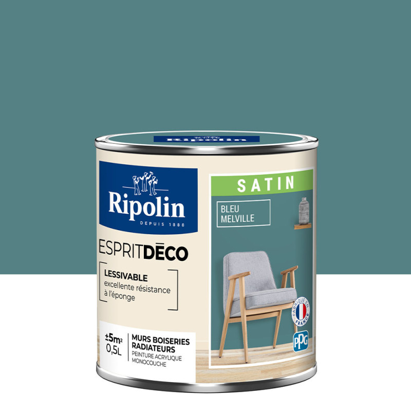Peinture murs boiseries radiateurs Ripolin bleu melville 0.5L. La gamme RIPOLIN Esprit Déco permet de redécorer toutes les pièces pour suivre toutes les idées et toutes les envies. Peinture monocouche au bon pouvoir opacifiant, elle s'applique facilement sur les murs, les boiseries et les radiateurs.