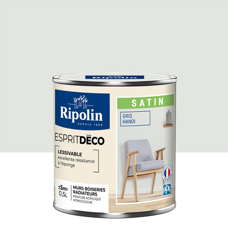 Peinture murs boiseries radiateurs Esprit Déco Ripolin gris hanoi satin 0.5L. La gamme RIPOLIN Esprit Déco permet de redécorer toutes les pièces pour suivre toutes les idées et toutes les envies. Peinture monocouche au bon pouvoir opacifiant, elle s'applique facilement sur les murs, les boiseries et les radiateurs.