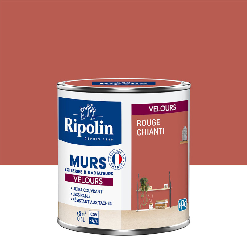 Peinture murs boiseries radiateurs Esprit Déco Ripolin rouge chianti velours 0.5L. La gamme RIPOLIN Esprit Déco permet de redécorer toutes les pièces pour suivre toutes les idées et toutes les envies. Peinture monocouche au bon pouvoir opacifiant, elle s'applique facilement sur les murs, les boiseries et les radiateurs.