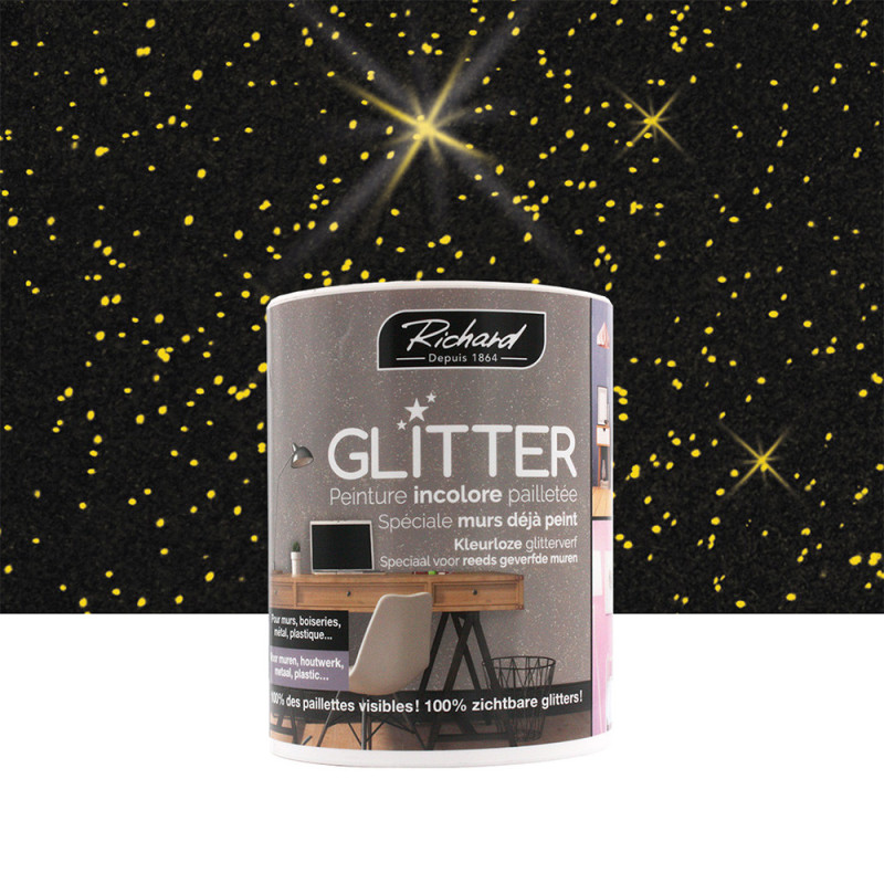 Faites scintiller vos créations avec le vernis pailleté Glitter or 1L, un vernis incolore avec des paillettes multicolores pour un effet irisé unique sur toutes vos décorations. Idéal pour sublimer peintures, textiles, meubles ou objets déco, ce produit polyvalent s'applique facilement sans avoir à tout repeindre. Parfait pour les finitions, il s’utilise sur une multitude de surfaces tout en conservant l’éclat des paillettes. Pour un rendu optimal, évitez de repasser plusieurs fois au même endroit avec la peinture et dosez le vernis avec soin pour conserver toute la brillance des paillettes.
