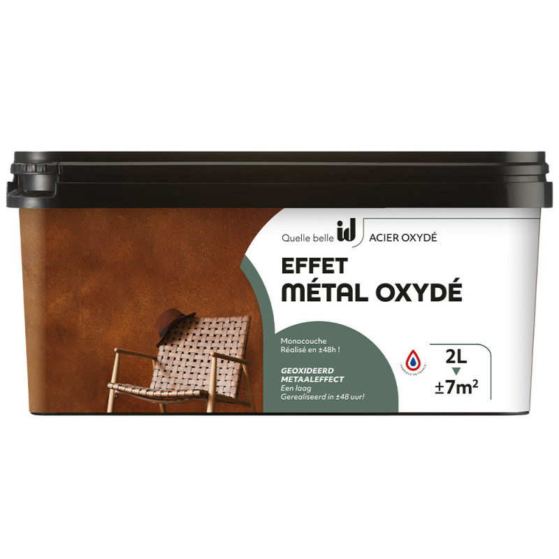 Transformez vos surfaces avec style grâce à notre peinture protectrice effet métal acier oxydé 2L. Ce système décoratif unique en trois étapes offre un rendu rouillé hyper réaliste sur vos murs, boiseries et objets décoratifs. L'ensemble comprend un enduit noir chargé en particules de fer, un oxydant pour provoquer la réaction et un protecteur pour fixer durablement l’effet. L’application se fait simplement à la spatule, en une couche. L’oxydation se déclenche lors de l'application de l’oxydant, révélant un effet métal vieilli spectaculaire. Ce produit est destiné uniquement à un usage intérieur, hors pièces humides (salles de bain, cuisines, douches, plans de travail, etc.). Idéal pour créer une ambiance industrielle ou contemporaine avec un rendu authentique.