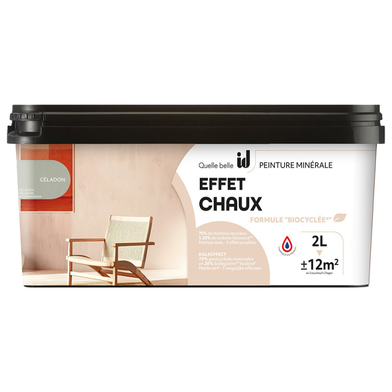 Peinture épaisse à effet de chaux, coloris Vert Céladon, idéale pour créer une atmosphère naturelle et apaisante. S’applique selon l’effet désiré : structuré au spalter, lissé à la taloche ou pommelé au rouleau. Formule respectueuse de l’environnement avec 70 % de matières recyclées (poudre de marbre, coquilles d’œufs) et plus de 20 % de carbone biosourcé. Finition minérale sur mesure !
