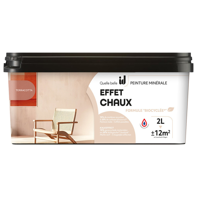 Peinture épaisse effet de chaux, teinte Terracotta, pour une ambiance chaleureuse et authentique. Application possible au spalter (structuré), à la taloche (lissé) ou au rouleau (pommelé) selon le rendu désiré. Formule écoresponsable avec 70 % de matières recyclées (poudre de marbre, coquilles d’œufs) et plus de 20 % de carbone biosourcé. Avec une finition minérale personnalisable !