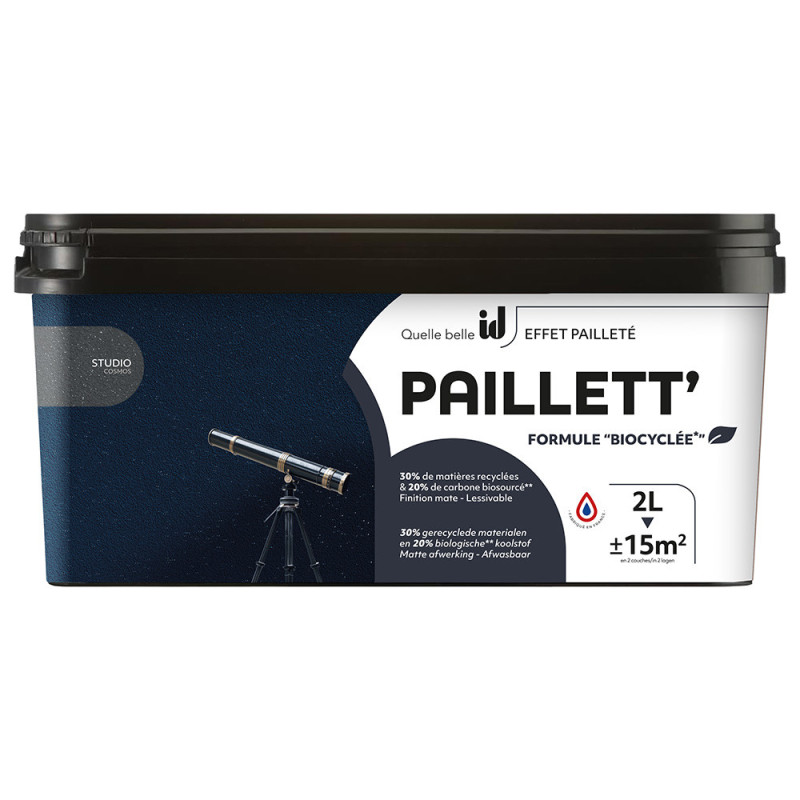 Relookez vos murs et boiseries avec la peinture mate pailletée ID Paillet' Noir Cosmos, qui contient de vraies paillettes pour un effet scintillant. Facile à appliquer en une seule couche au rouleau à poils mi-longs, cette peinture donne à vos murs un éclat qui change selon la lumière. Lessivable et idéale pour toutes les pièces de vie. Les paillettes sont déjà mélangées dans la peinture pour une application rapide et un résultat spectaculaire.