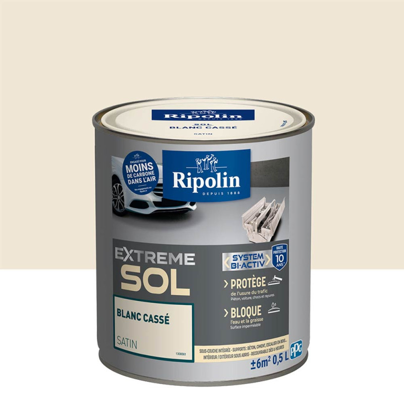 La peinture Ripolin de couleur blanc cassé, extreme sol est idéale pour la protection et la décoration des sols intérieurs et extérieurs sous abris. Elle est auto-nivelante avec un tendu parfait. Sa formule triple action permet une résistance extrême aux passages de pneus chauds et humides, une résistance aux taches et une haute tenue aux rayures et aux chocs. Circulable aux véhicules 10 jours après l'application.
